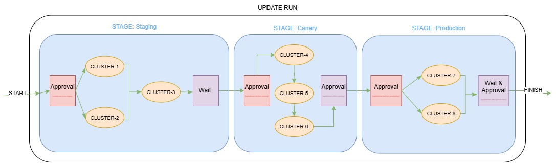 Staged update strategies define reusable orchestration patterns that organize target clusters into stages with specific rollout sequences and approval gates. Both scopes use similar configurations but operate at different levels.